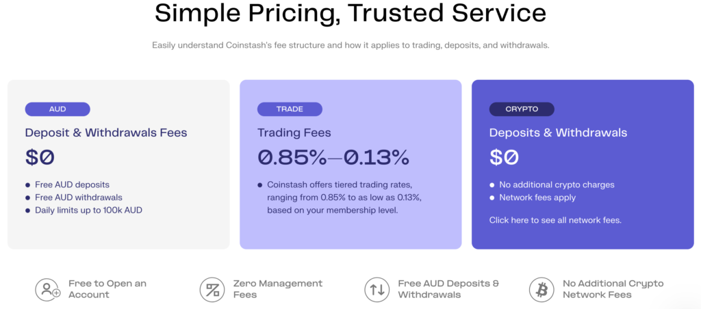 | Withdrawal Fees | No fees for AUD withdrawals; crypto withdrawal fees vary by network |